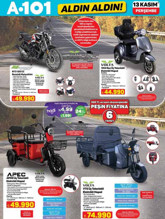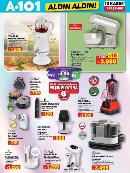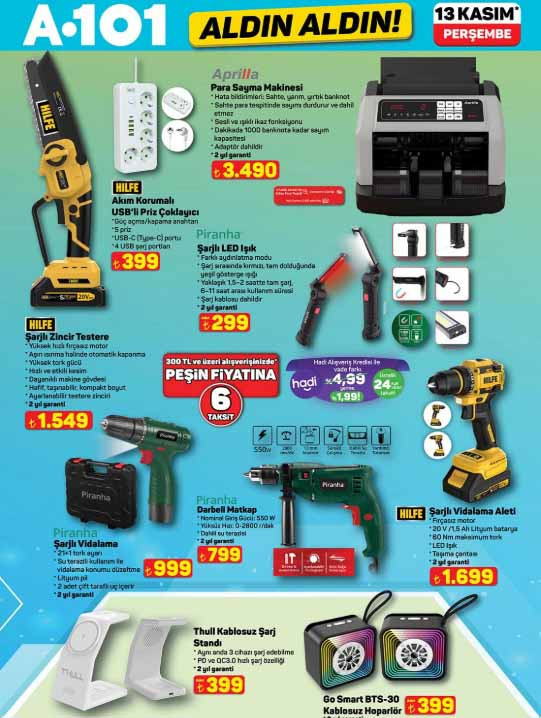A101 Aktüel katalog ürünleri raflardan sepete eklenmeye hazırlanıyor. 13 Kasım 2025 A101 Aldın Aldın afişi ile bu Perşembe yine çeşit çeşit ürünler satışa sunulacak. Bu hafta A101 aktüel broşürü içerisinde; elektrikli semaver 1.599 TL, para sayma makinesi 3.490 TL, bluetooth ve hoparlörlü katlanabilir koşu ve yürüyüş bandı 9.999 TL, epilasyon seti 1.299 TL, waffle makinesi 799 TL, koltuk ve halı yıkama makinesi 3.499 TL, VT5 üç tekerlekli elektrikli moped 74.990 TL, refleks geliştirici boks makinesi 1.499 TL, manyetik kondisyon küreği 9.499 TL, XL filtreli sürahi 499, şarjlı vidalama 999 TL, kablosuz şarj standı 399 TL, şarjlı LED ışık 299 TL ile müşterilerin beğenisine sunulacak. Peki A101 aktüel afişi bu Perşembe ürünleri neler? İşte 13 Kasım 2025 A101 afişi tam liste ürünler…