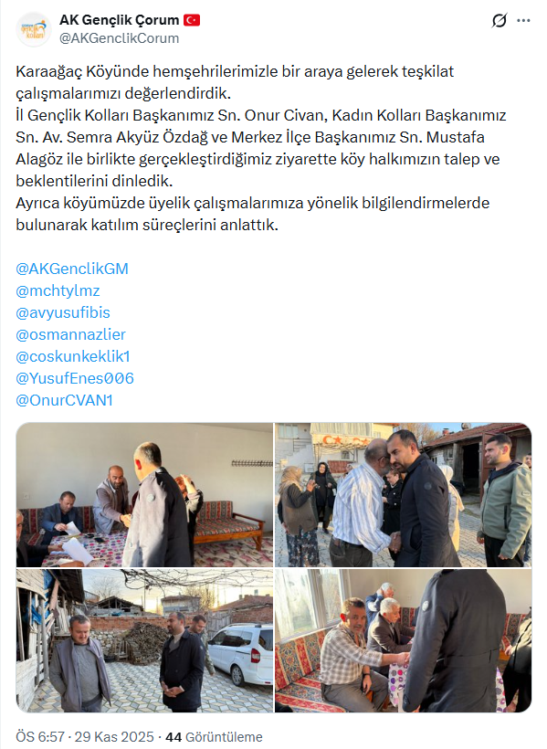 T24’ten Elvan Yılmaz’ın haberine göre; AKP’liler üye çalışması için gittikleri köy ziyaretlerini AKP Çorum Merkez ilçe teşkilatı sosyal medya hesabından duyururken, paylaştıkları görsellerde AKP yönetimindeki Çorum Belediyesi’nin resmî aracının da yer alması dikkat çekti.