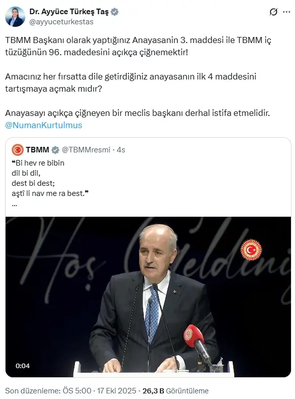 İYİ Parti Adana Milletvekili Ayyüce Türkeş Taş, Kurtulmuş’un Kürtçe konuşmasına tahammül edemedi. Sosyal medya hesabından açıklama yapan Taş, skandal bir çağrıda bulundu. Taş açıklamasında şunları söyledi: TBMM Başkanı olarak yaptığınız Anayasanin 3. maddesi ile TBMM iç tüzüğünün 96. madedesini açıkça çiğnemektir!