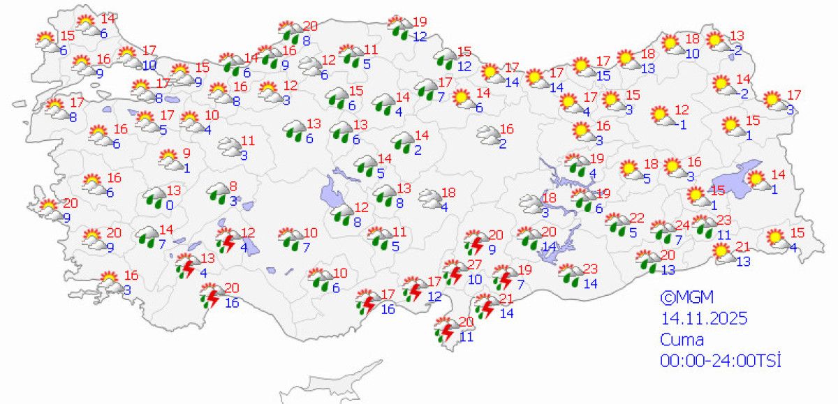 Güneyde Antalya’da 23 derece sıcaklık ve kuvvetli sağanak; İç Anadolu’da Konya’da 20 derece sıcaklık ve dolu riski bekleniyor.