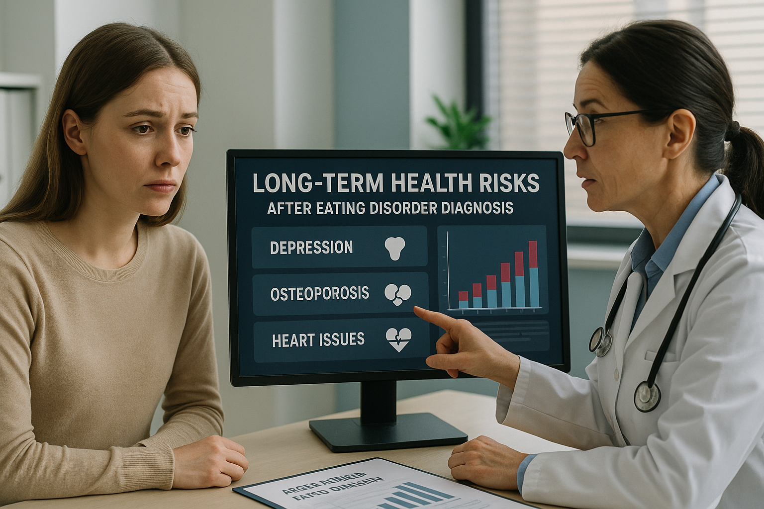 Tanıdan sonraki ilk bir yıl içinde, yeme bozukluğu olan bireylerde karaciğer hastalıkları, böbrek yetmezliği, osteoporoz, diyabet, kalp yetmezliği, depresyon, kendine zarar verme ve intihar gibi sorunların görülme olasılığı anlamlı şekilde daha yüksek bulundu.